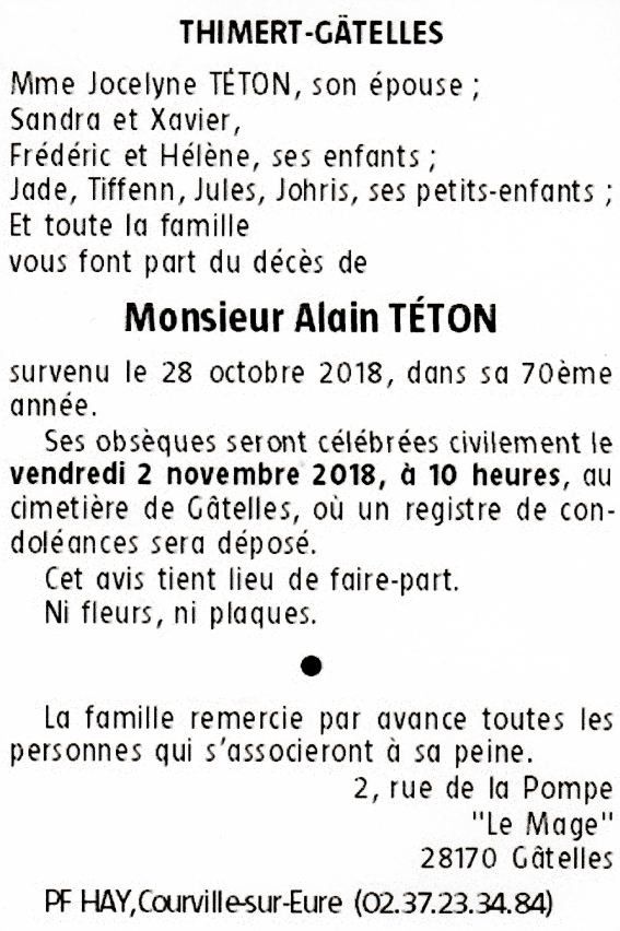 Décédé à Thimert-Gâtelles (28170, France) le dimanche 28 octobre 2018 à l'âge de 69 ans