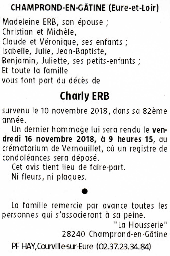 Décédé à Champrond-en-Gâtine (28240, France) le samedi 10 novembre 2018 à l'âge de 81 ans