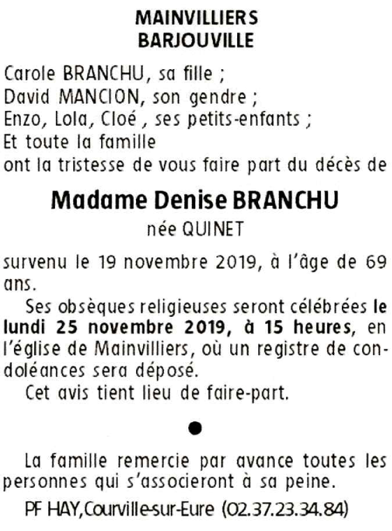 Décédée à Le Coudray (28630, France) le mardi 19 novembre 2019 à l'âge de 69 ans