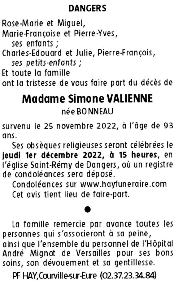Madame Simone VALIENNE née BONNEAU