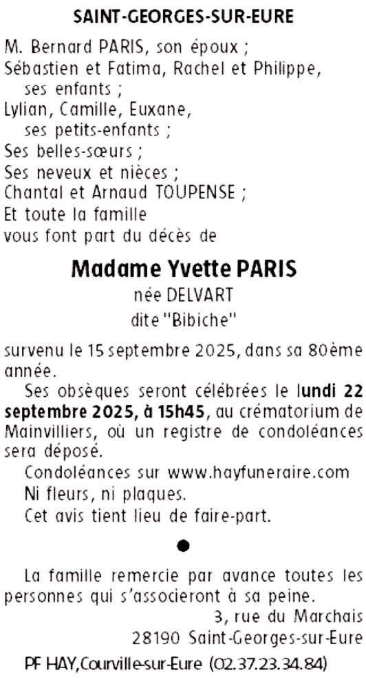 Décédée à Le Coudray (28630, France) le lundi 15 septembre 2025 à l'âge de 79 ans