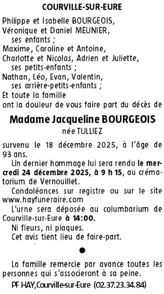 Décédée à Courville-sur-Eure (28190, France) le jeudi 18 décembre 2025 à l'âge de 93 ans