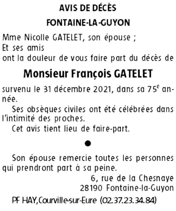 Décédé à Fontaine-la-Guyon (28190, France) le vendredi 31 décembre 2021 à l'âge de 74 ans
