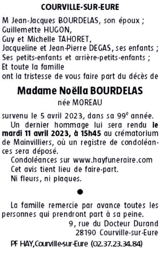Décédée à Courville-sur-Eure (28190, France) le mercredi 5 avril 2023 à l'âge de 98 ans