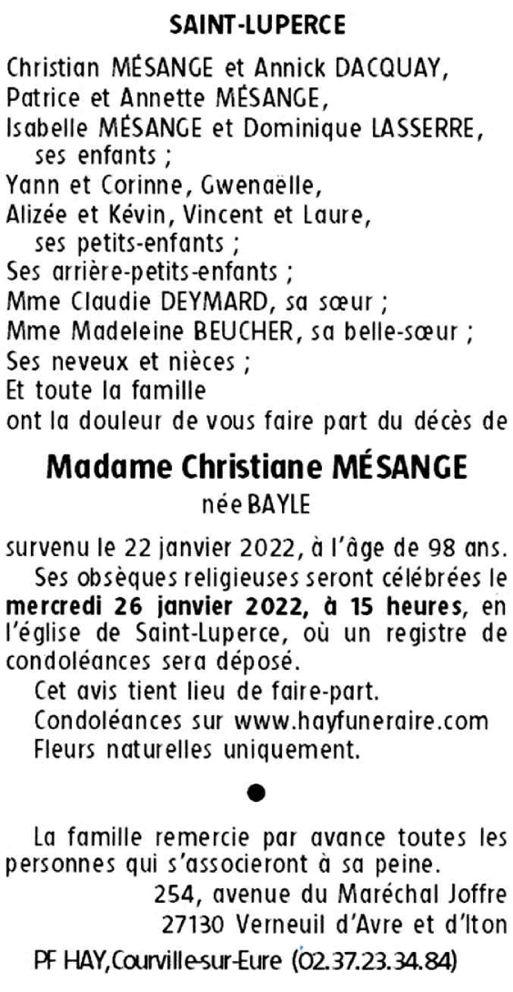 Décédée à Verneuil sur Avre (27130, France) le samedi 22 janvier 2022 à l'âge de 98 ans