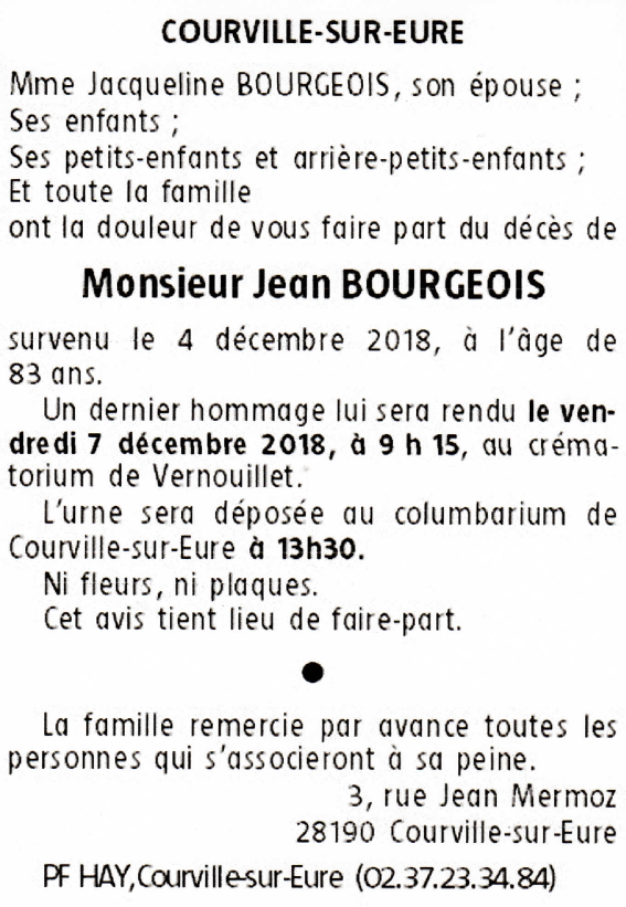 Décédé à Courville-sur-Eure (28190, France) le mardi 4 décembre 2018 à l'âge de 83 ans