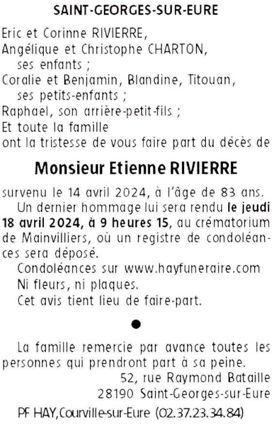 Décédé à Chartres (28000, France) le dimanche 14 avril 2024 à l'âge de 83 ans