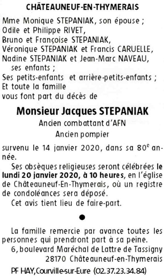 Décédé à Châteauneuf-en-Thymerais (28170, France) le mardi 14 janvier 2020 à l'âge de 79 ans