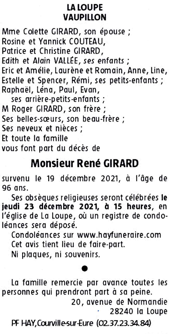 Décédé à La Loupe (28240, France) le dimanche 19 décembre 2021 à l'âge de 96 ans