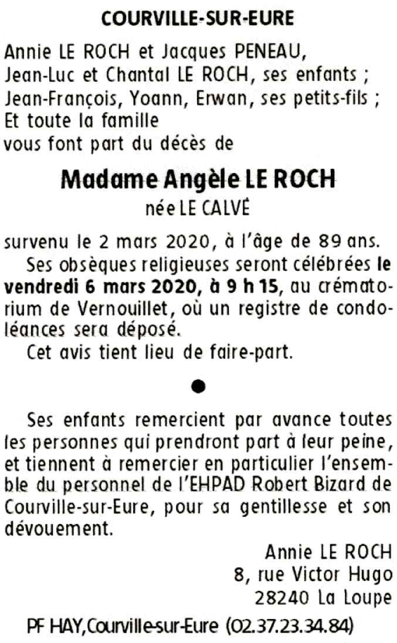 Décédée à Le Coudray (28630, France) le lundi 2 mars 2020 à l'âge de 89 ans