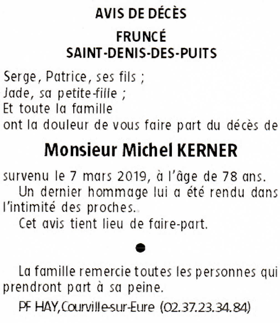 Décédé à Frunce (28190, France) le jeudi 7 mars 2019 à l'âge de 78 ans
