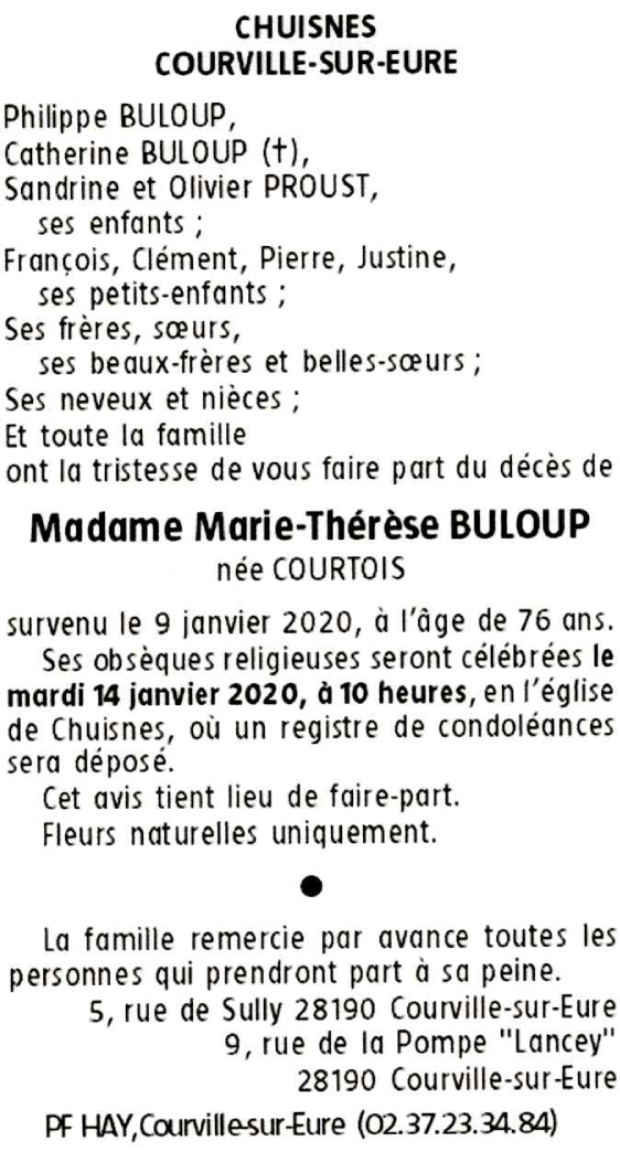 Décédée à La Loupe (28240, France) le jeudi 9 janvier 2020 à l'âge de 76 ans