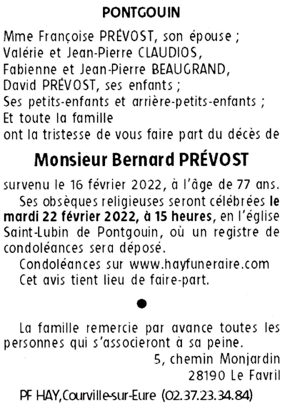 Décédé à Le Favril (28190, France) le mercredi 16 février 2022 à l'âge de 77 ans