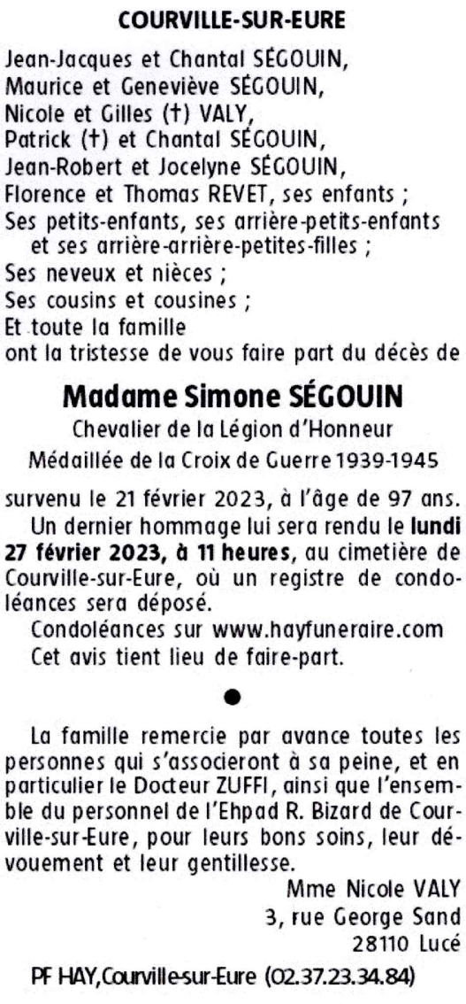 Décédée à Courville-sur-Eure (28190, France) le mardi 21 février 2023 à l'âge de 97 ans