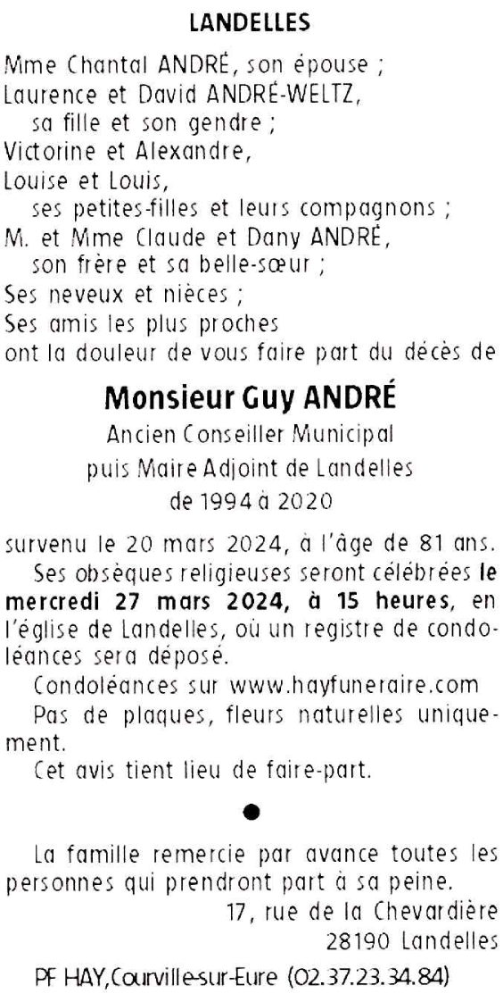 Décédé à Landelles (28190, France) le mercredi 20 mars 2024 à l'âge de 81 ans