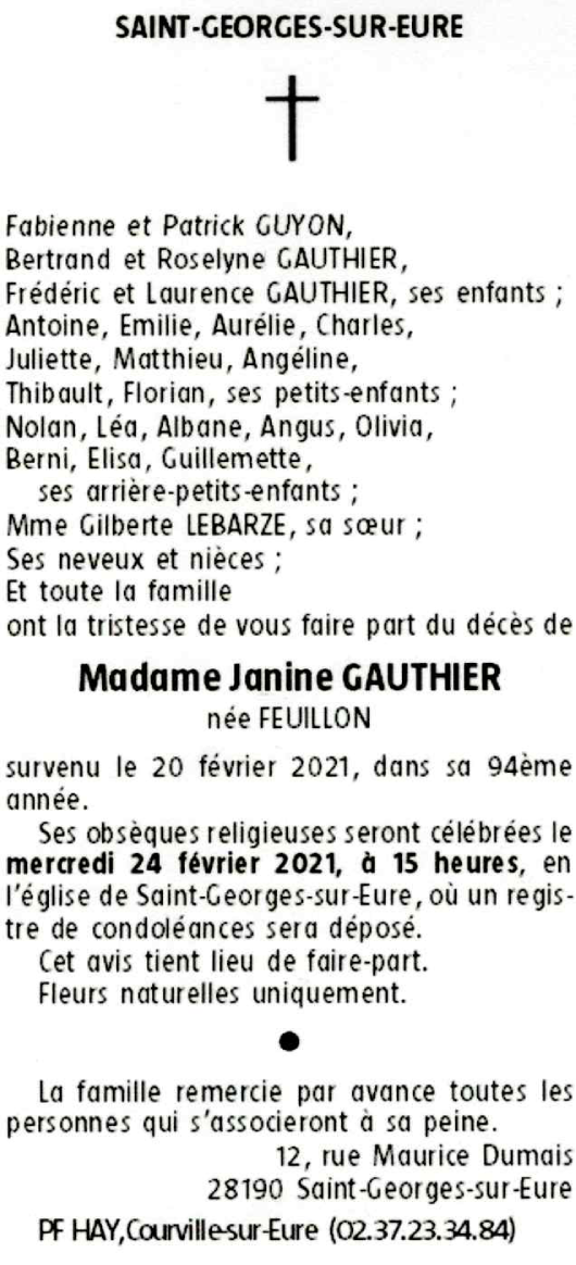Décédée à Le Coudray (28630, France) le samedi 20 février 2021 à l'âge de 93 ans