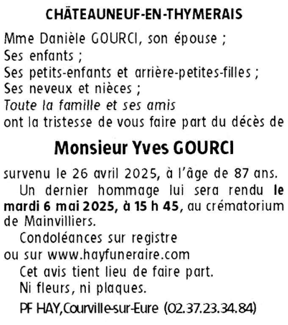 Décédé à Châteauneuf-en-Thymerais (28170, France) le samedi 26 avril 2025 à l'âge de 87 ans