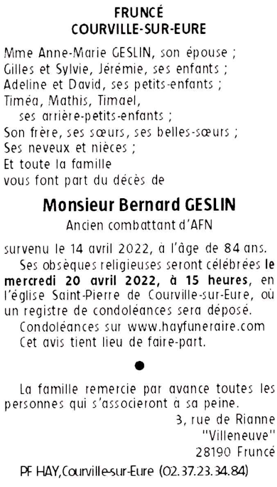 Décédé à Le Coudray (28630, France) le jeudi 14 avril 2022 à l'âge de 84 ans