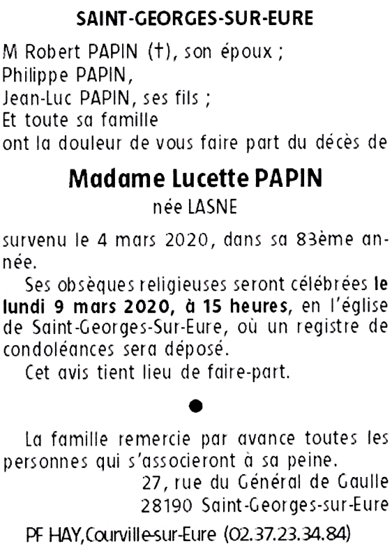 Veuve de Monsieur Robert PAPIN