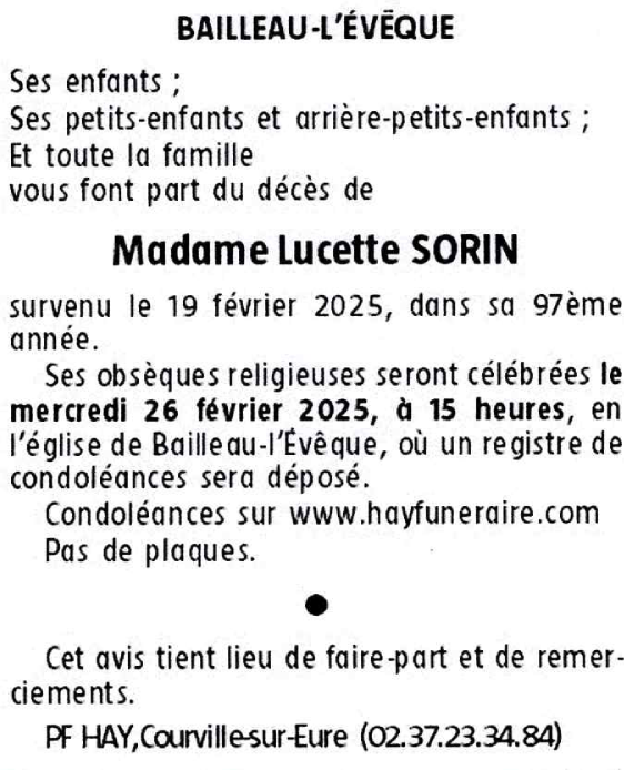 Décédée à La Loupe (28240, France) le mercredi 19 février 2025 à l'âge de 96 ans