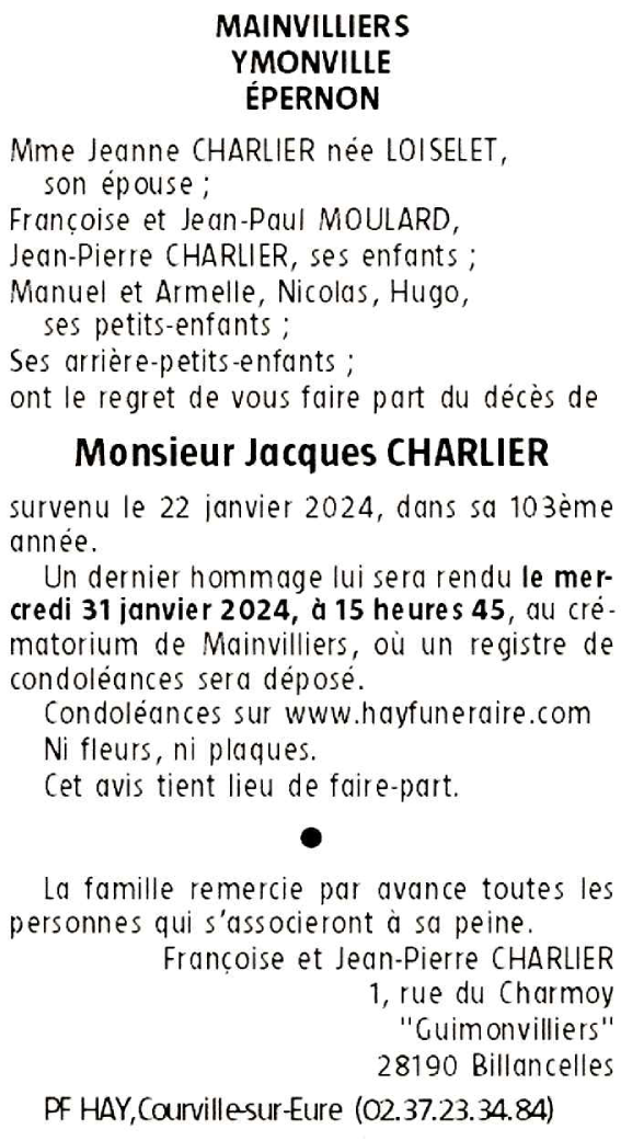 Décédé à Illiers-Combray (28120, France) le lundi 22 janvier 2024 à l'âge de 102 ans