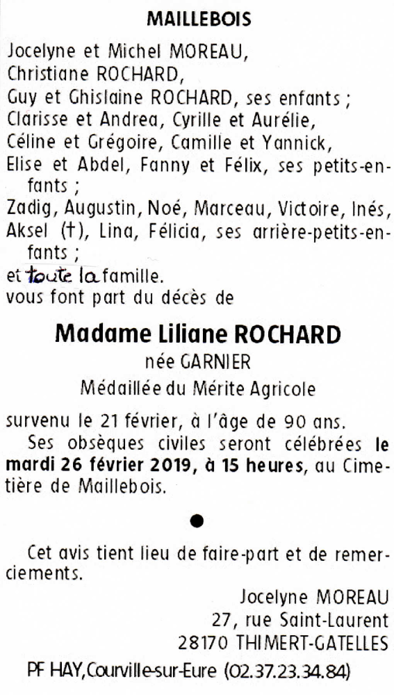 Madame Liliane ROCHARD née GARNIER
