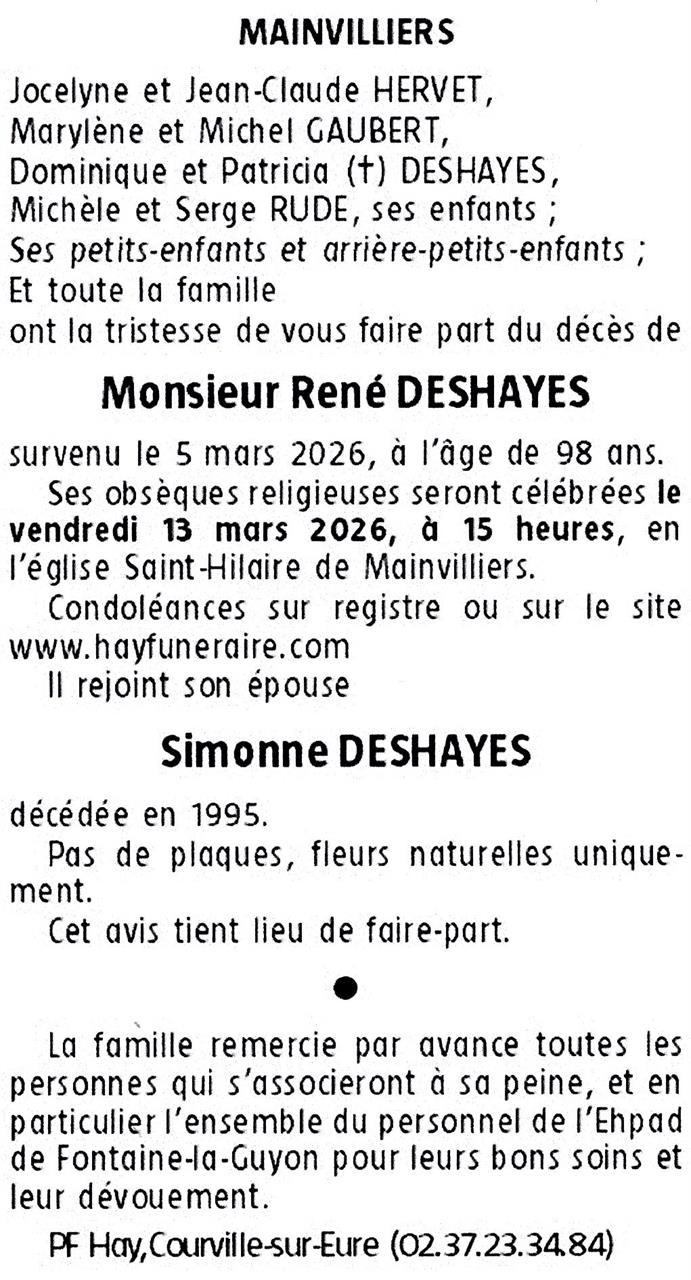 Décédé à Le Coudray (28630, France) le jeudi 5 mars 2026 à l'âge de 98 ans