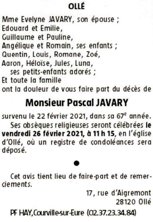 Décédé à Olle (28120, France) le lundi 22 février 2021 à l'âge de 66 ans