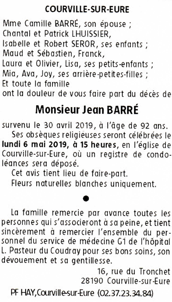 Décédé à Le Coudray (28630, France) le mardi 30 avril 2019 à l'âge de 92 ans