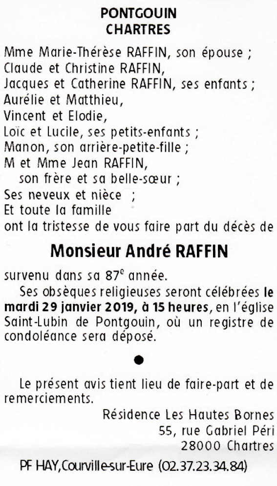 Décédé à Le Coudray (28630, France) le vendredi 25 janvier 2019 à l'âge de 86 ans