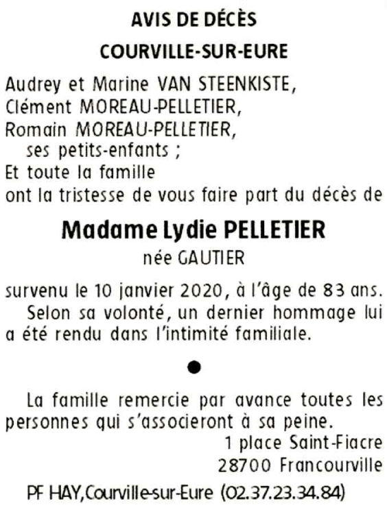 Décédée à Courville-sur-Eure (28190, France) le vendredi 10 janvier 2020 à l'âge de 83 ans