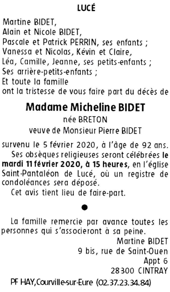 Décédée à Gasville-Oisème (28300, France) le mercredi 5 février 2020 à l'âge de 92 ans