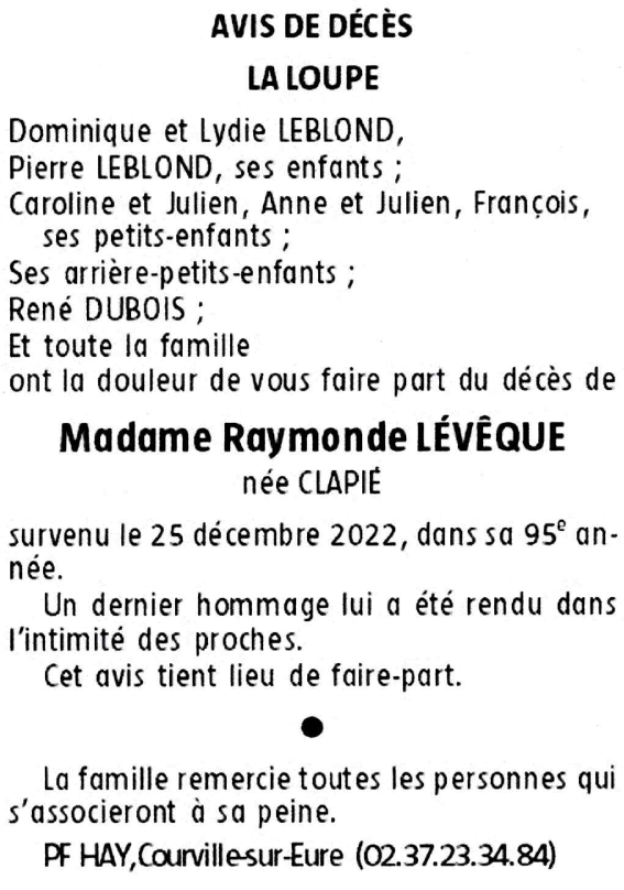 Madame Raymonde LEVÊQUE née CLAPIÉ