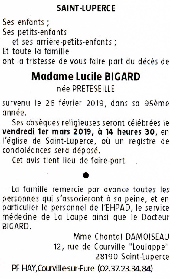Madame Lucile BIGARD née PRETESEILLE